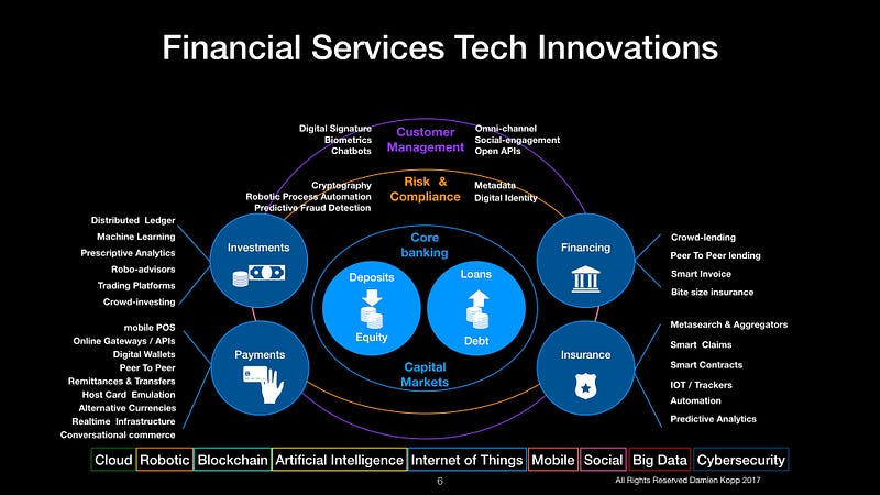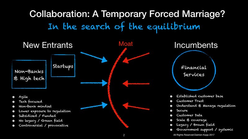 FinTech 1.0 was a direct confrontation between the new entrants and the financial institutions; but it failed. Mainly due to the lack of understanding of the complexity of the environment and the regulatory constraints. FinTech 1.0 lesson’s learnt is that it was too early for the “Uber” moment of Financial Services. FinTech 2.0 is getting smarter (and maybe temporarily more modest): it’s all about collaboration. For now. A win-win equilibrium while each side continuous to sharpen their knives.