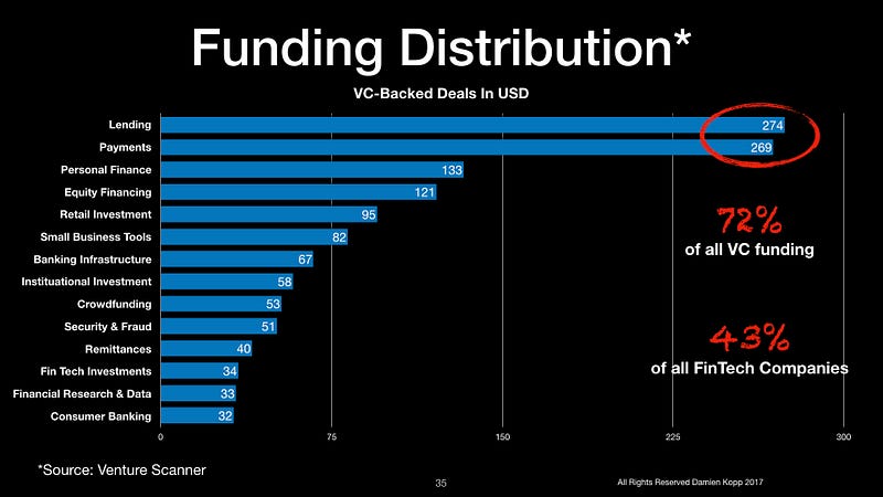 • VC-backed FinTech companies raised $13B across 836 deals in 2016 (CB Insights) and global FinTech investment is estimated at $36B USD (Let’s Talk Payments)